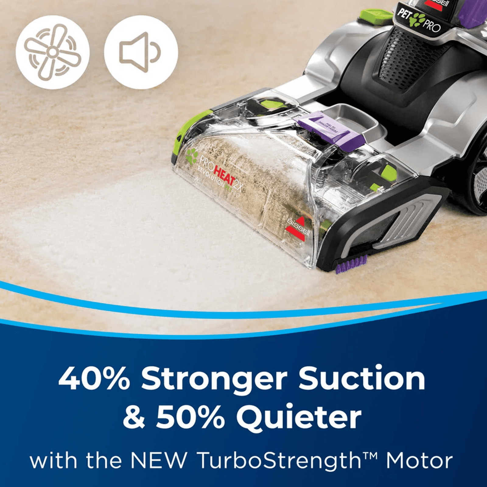 ProHeat 2X Revolution Pet features the performance, power, and technology to remove embedded dirt and tough stains. Our NEW TurboStrength Motor Technology delivers 40% more suction and a 50% quieter clean (compared to the previous model).